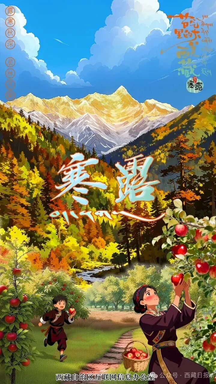 萧萧秋意重,依依寒色浓 《月令七十二候集解》说 寒露,九月节 露气寒冷,将凝结也 寒露时节 寒露凝结成珠 草木披上秋色 寒露赏枫 是流传已久的古老传统 在西藏 寒露节气也恰是观赏林芝彩林 品尝当地水果的绝佳时节 此时,寒露的露珠仿佛蘸饱颜料的笔尖,轻轻一点——树叶红了、果子熟了,大自然用绚烂色彩晕染的视觉盛宴呈现在世人面前。 南伊沟中,溪流潺潺,层林尽染,金黄与火红交织,一幅流动的彩色画卷正徐徐展开,好似打开了通往童话世界的大门。
