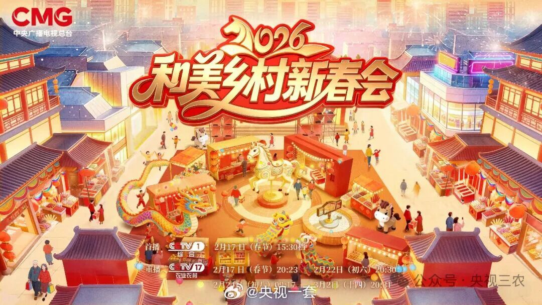 城乡汇聚庆丰年,和和美美迎新春!中央广播电视总台2026年《和美乡村新春会》将于大年初一(2月17日)在CCTV-1综合频道15:30档、CCTV-17农业农村频道20:23档重磅亮相。晚会首次将土特产大集搬进北京城区潮流打卡地,以“新春集市+现场演出+外景连线+纪录短片+AI共创”多元形式,为全国观众送上一场兼具乡土温情与时代气息的新春视听盛宴。在热气腾腾的烟火年味里,生动铺展乡村全面振兴新图景,全景呈现中国农业农村现代化的万千气象。http://t.cn/AXtO0eSn (来源:央视三农)