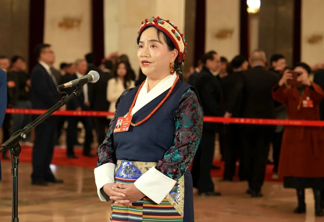 图为在全国政协十四届四次会议第二场“委员通道”,明吉措姆回答记者提问。记者 陶玥 摄