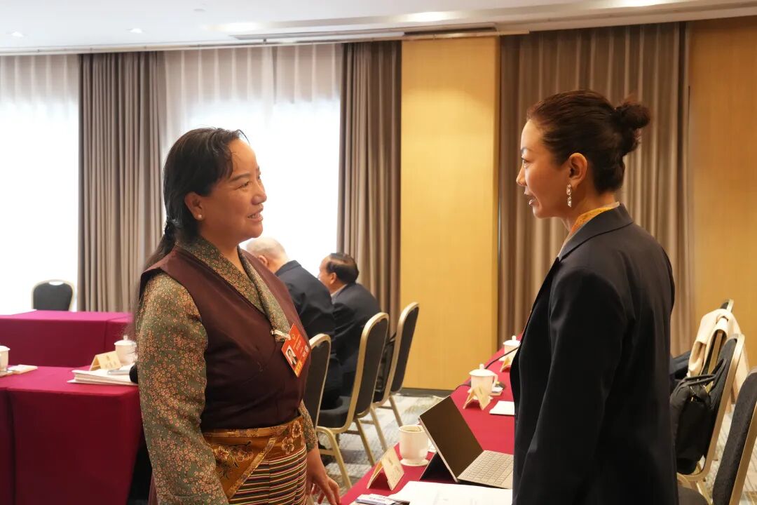 图为明吉措姆(左)与边巴拉姆在会议间隙交流心得。记者 陶玥 摄