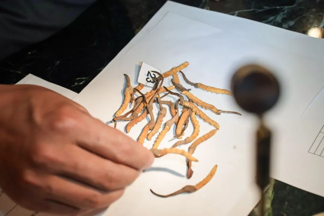 王光辉教授介绍,“评审主要依据三项标准:虫体需呈金黄色,草体为棕色;含水率要低;并通过称重20根虫草综合计算得分,全面评估虫草品质。”