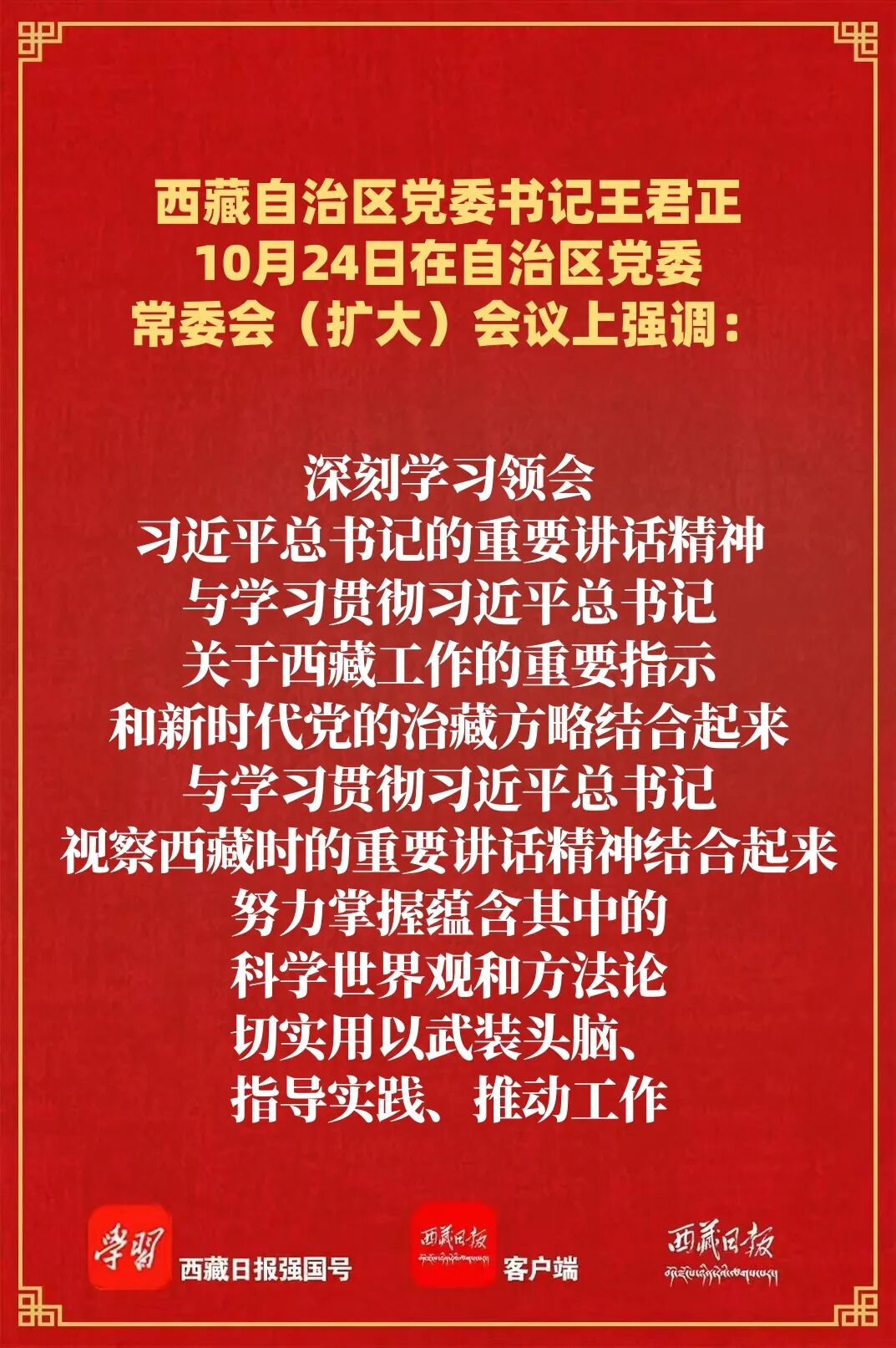 王君正强调,要弘扬理论联系实际的学风,结合西藏实际,持续深入抓好稳定、发展、生态、强边四件大事落实,确保习近平总书记重要指示和党中央决策部署在雪域高原落地生根、开花结果。坚持不懈抓好全会精神的贯彻落实,增强大局意识、全局观念,自觉把西藏工作置于党和国家工作大局中研究思考、谋划推动,科学谋划“十五五”全区经济社会发展规划,为未来发展打下坚实基础。坚持不懈贯彻落实习近平总书记关于西藏工作的重要指示和新时代党的治藏方略,积极推动“四件大事”落实,坚持以铸牢中华民族共同体意识为主线,深入推进全国民族团结进步模范区创建,持续巩固团结稳定的政治和社会局面;把“三个赋予一个有利于”总要求贯穿经济社会发展始终,因地制宜推动高原经济高质量发展,让发展成果更多更公平惠及各族群众;认真践行“两山”理念,严格落实青藏高原生态保护法,守护好雪域高原的生灵草木、万水千山;坚持屯兵和安民并举、固边和兴边并重,深入推进国家固边兴边富民行动示范区建设,坚定维护国家核心利益。