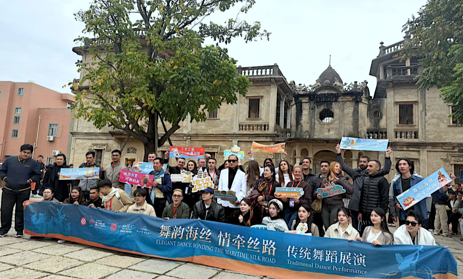 图为传统舞蹈展演结束后,国内外艺术团集体合影留念